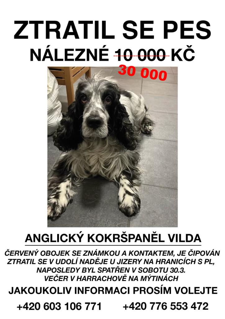 STÁLE SE NENAŠEL...Prosíme o pomoc při hledání kokršpaněla Vildy. Odměna navýšena na 30000,- Kč. Kontakt pro případné informace: Kristyna Bílá 603106771. Děkujeme!
